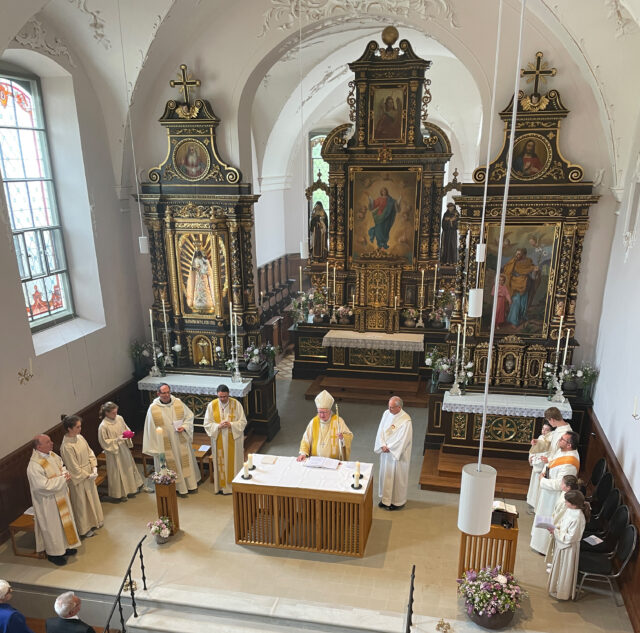 «In dieser wunderbar renovierten Klosterkirche wird sichtbar dargestellt, dass Gott gegenwärtig ist in dieser Welt», sagte Bischof Markus Büchel mit grosser Freude anlässlich des Einweihungsgottesdienstes mit Altarweihe gestern Samstag, 4. Mai 2024. Mitglieder des Vereins Kloster Maria Rosengarten Wonnenstein sowie Gäste aus Kirche und Politik waren gekommen, um den gelungenen Abschluss der zweijährigen Bauphase zu feiern.