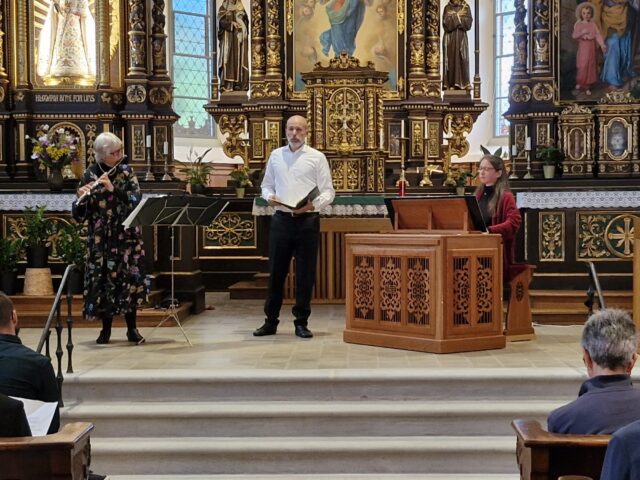 Daniel Thiel (Tenor), begleitet von Gisela Juchli (Querflöte) und Verena Förster (Truhenorgel) – siehe Bild – begeisterte das Publikum mit seiner farbigen Interpretation der Arien und entführte es in eine wenig bekannte Musikwelt. Die Bach-Werke spielte Verena Förster auf der historischen Kirchenorgel.